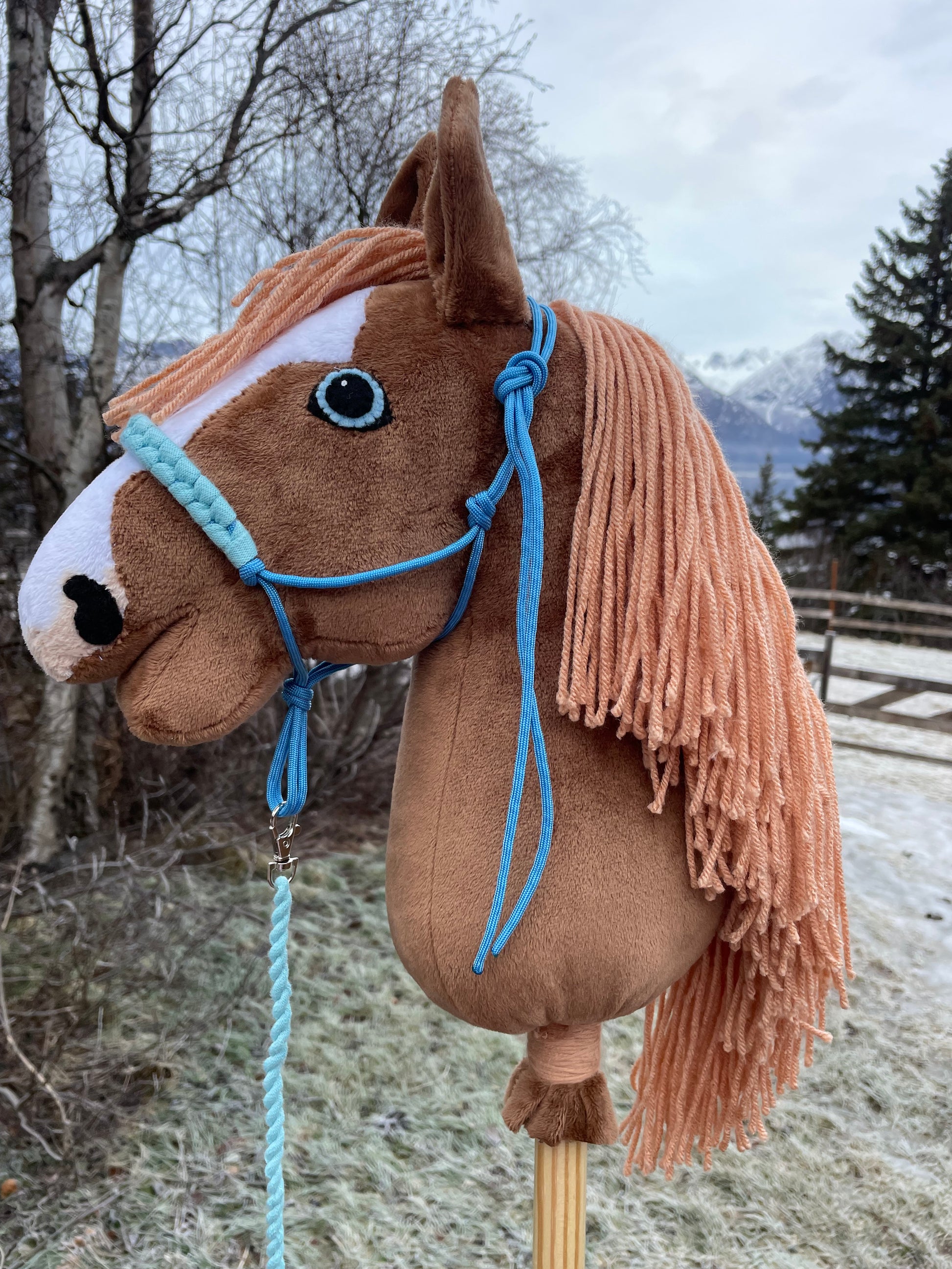 Custom hobby horse brown. Comes with a light blue halter and lead rope.