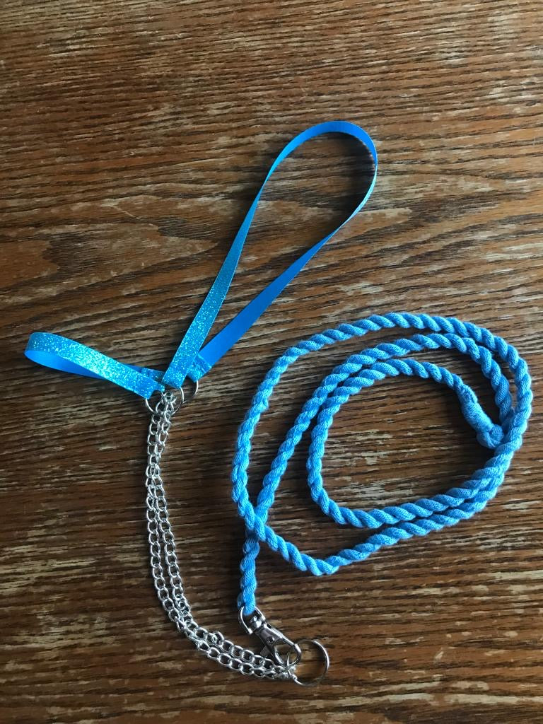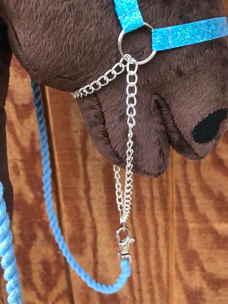 This is a beautiful show halter with lead rope for your hobby horse! The halter has a chain under the nose and fits to different size of horses.